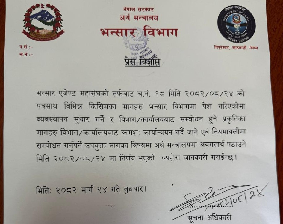 विभागले आजै प्रकाशन गरेको विज्ञप्तिमा भनिएको छ, ‘‘भन्सार एजेण्ट महासंघको तर्फबाट विभिन्न किसिमका मागहरु भन्सार विभागमा पेश गरिएकोमा व्यवस्थापन सुधार गर्ने र विभाग र कार्यालयबाट सम्बोधन हुने प्रकृतिका मागहरु विभाग र कार्यालयबाट क्रमशः कार्यान्वयन गर्दै जाने एवम् नियमावलीमा सम्बोधन गर्नुपर्ने उपयुक्त मागका विषयमा अर्थ मन्त्रालयमा अवगतार्थ पठाउने निर्णय भएको छ ।’’